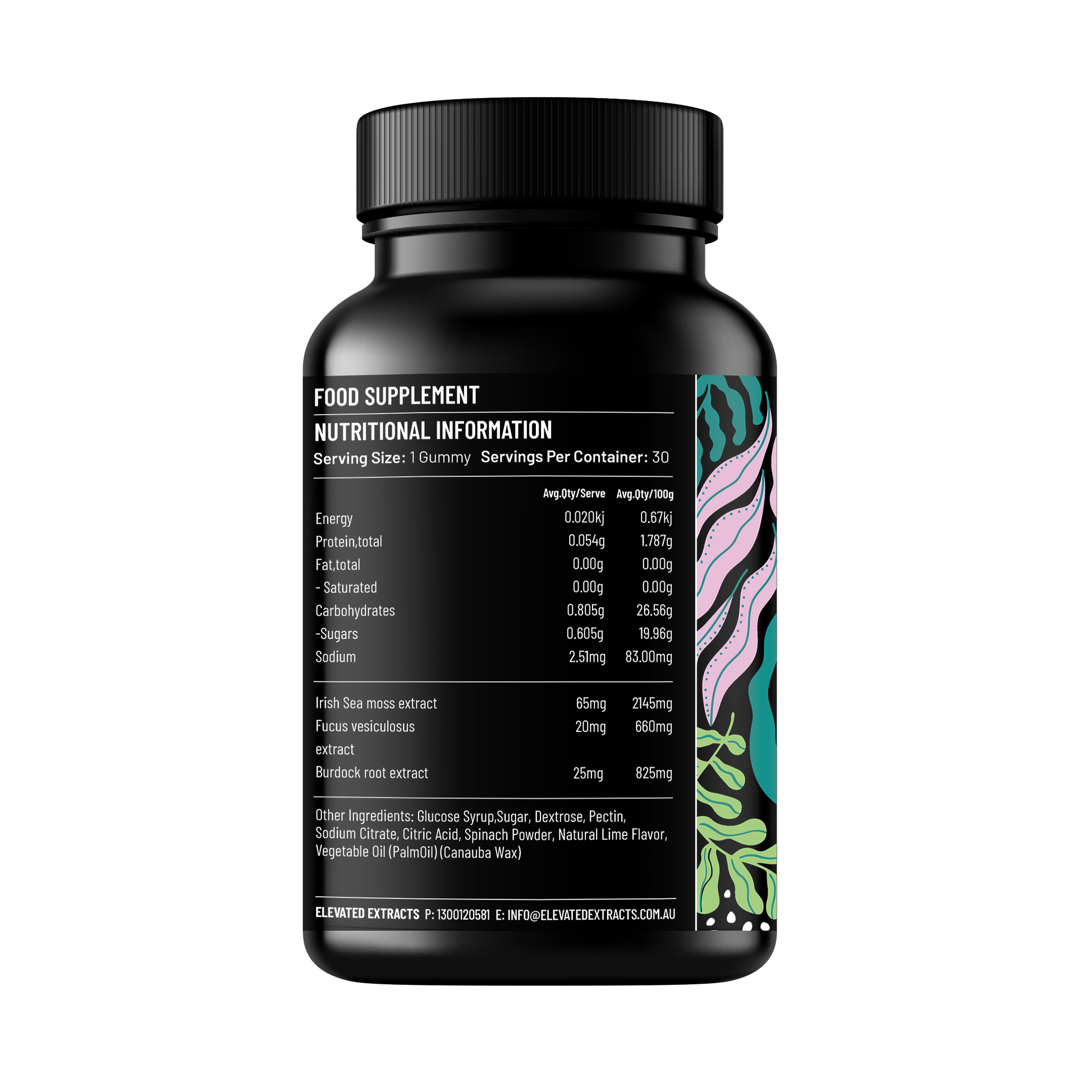 Harness the power of the ocean with Irish Sea Moss Gummies! Enriched with Irish sea moss, Fucus vesiculosus extract, and burdock root, these gummies support skin health, digestion, and immunity. Packed with essential nutrients and antioxidants, they’re a simple, effective addition to your wellness routine.